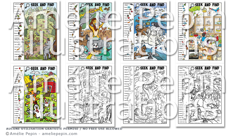 L'enfant cherche et trouve les éléments de la liste dans l'illustration. Il peut aussi colorier les versions en noir et blanc. Les thèmes suivants sont illustrés: forêt et animaux, les animaux du zoo, l'Arctique, l'animalerie et la ferme.