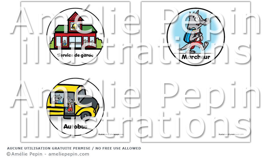 Illustrations du service de garde, de l'autobus et du marcheur avec des loups dans des cercles mesurant 4 1/2 po X 4 1/2 pouces. Ce fichier est prêt à être imprimé afin que vous puissiez découper les images et les coller dans votre système de départ.
