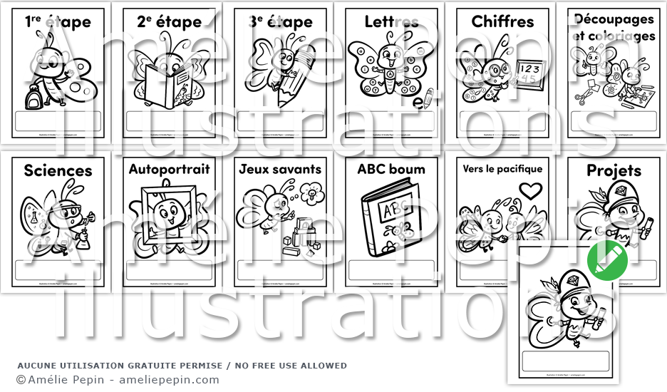 Voici 12 pages couvertures illustrées avec des papillons pour identifier les Duo-tangs ou les cahiers. Les titres écrits en français dans la version PDF sont: 1re étape, 2e étape, 3e étape, Autoportrait, Chiffres, Découpages et coloriages, Sciences, Lettres, Jeux savants, ABC boum, Vers le pacifique et Projets.
