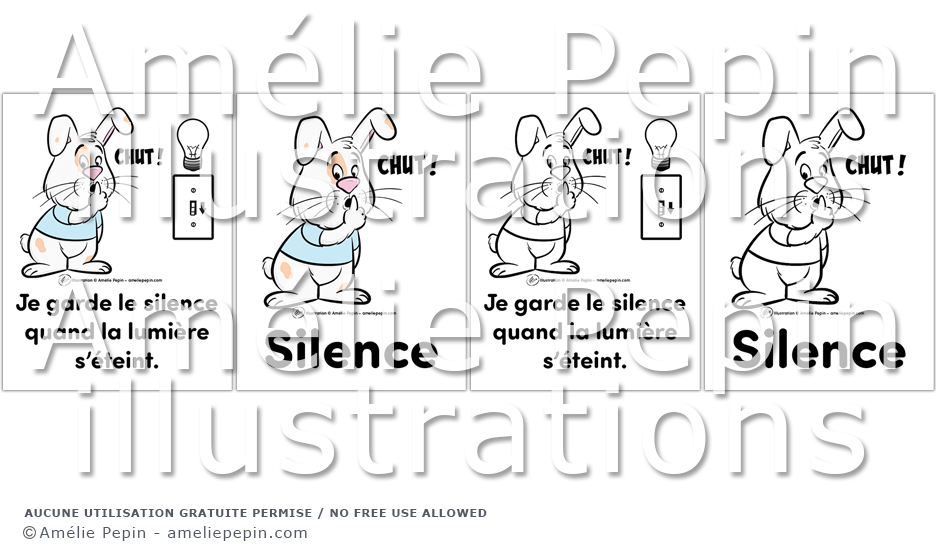 Règles de classe illustrées avec des lapins: "Silence" et "Je garde le silence quand la lumière s'éteint."