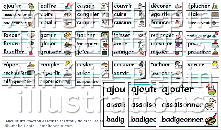 Les mots illustrés sont: ajouter, assaisonner, badigeonner, battre, boire, bouillir, casser, congeler, couper, couvrir, cuire, cuisiner, décorer, égoutter, émincer, éplucher, étaler, faire revenir, foncer, fondre, fouetter, garnir, glacer, graisser, hacher, incorporer, jeter, laver, manger, mélanger, mesurer, mijoter, monter en neige, peser, préparer, râper, réchauffer, réfrigérer, remplir, répartir, rouler, saler, saupoudrer, secouer, servir, tamiser, tartiner, trancher, tremper, verser.