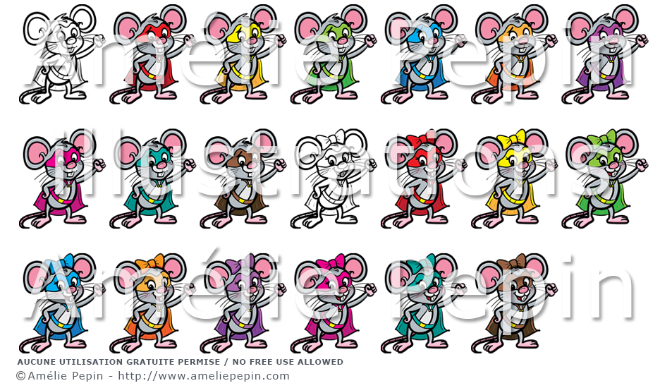 Ce dossier contient des images de souris (garçons et filles) en superhéros de différentes couleurs: rouge, jaune, vert, bleu, orange, violet, rose, turquoise, brun, gris, noir et blanc.