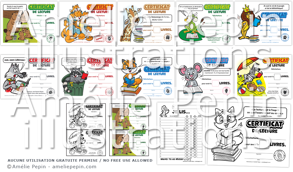 Suivez le cheminement de l'enfant à travers son apprentissage de la lecture grâce aux feuilles de parcours incluses dans cet ensemble. Pour chaque feuille de lecture complétée (maximum de 15 livres lus par fiche), vous pouvez remettre le certificat correspondant à l'élève en guise de récompense. Dix modèles sont offerts: castor, renard (x2), lion, loup, grenouille, raton laveur, souris, girafe et zèbre. Les feuilles de parcours sont en noir et blanc. Vous pouvez imprimer les mérites en couleurs ou en noir et blanc, un diplôme par page ou deux diplômes par page selon vos besoins. N'oubliez pas que vous pouvez également imprimer la version en noir et blanc sur une feuille teintée si votre budget ne vous permet pas l'impression en couleurs.