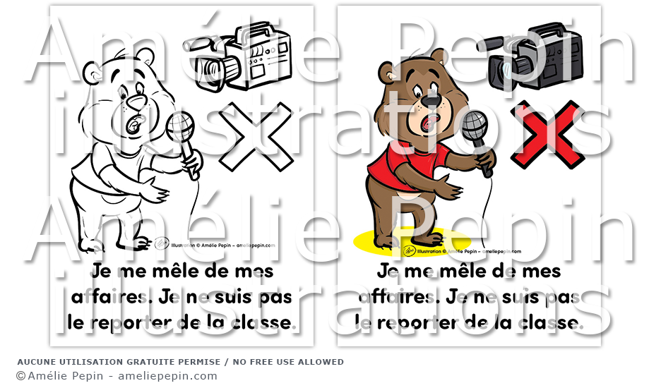 Règle de classe illustrée avec un ours: "Je me mêle de mes affaires. Je ne suis pas le reporter de la classe."