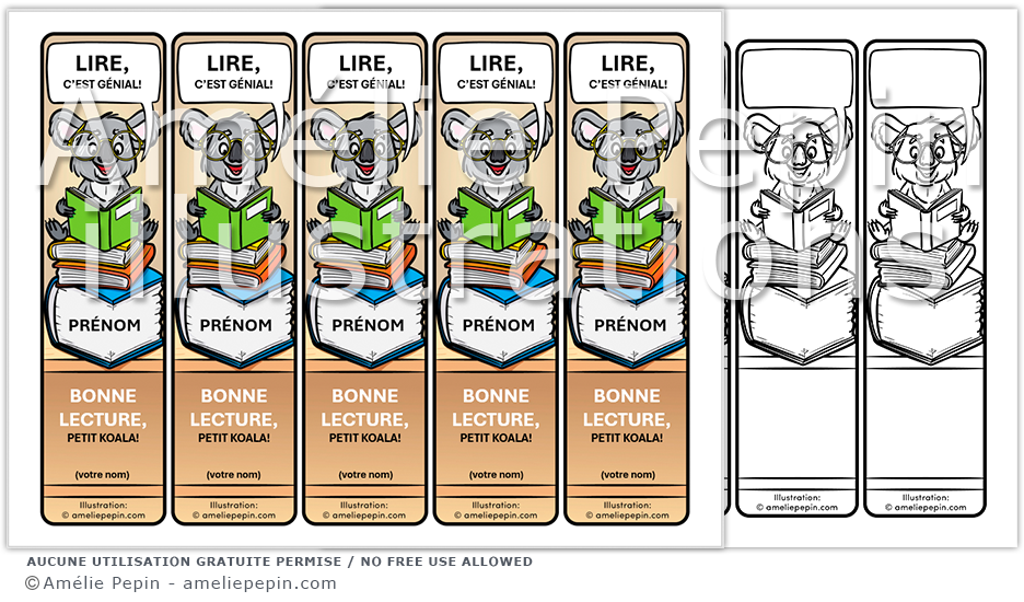 Signets aux coins arrondis illustrés avec un koala assis sur une pile de livres. Les textes suggérés que vous pouvez changer sur le signet sont: «Lire, c'est génial!» et «Bonne lecture, petit koala!».