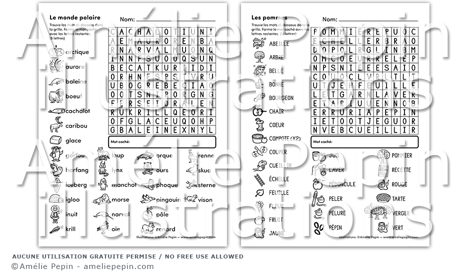 Les fichiers contiennent une page couverture, 15 mots cachés (mots mêlés) illustrés et une page de solutions. L'enfant trouve les mots dans la grille. Il forme le mot caché avec les lettres restantes. Les thèmes suivants sont illustrés: été, fruits et légumes, habillement, Halloween, insectes et bestioles, la ferme, la rentrée scolaire, l'espace, le monde polaire, le plein air, le temps des sucres, les Jeux olympiques d'hiver, les pommes, papillon, Pâques.