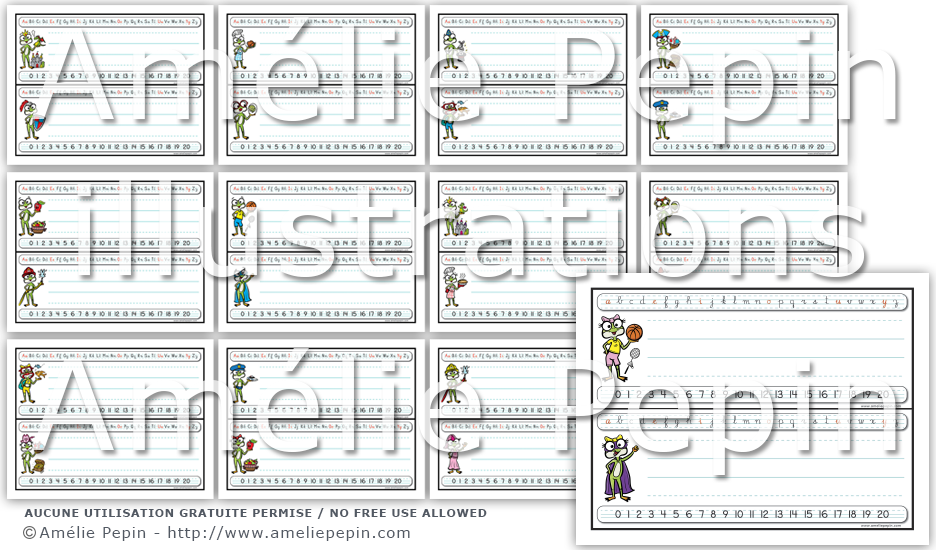 Chaque étiquette contient les lettres de l'alphabet en cursive avec les voyelles écrites en rouge, un trottoir pour écrire le prénom de l'enfant ainsi que les nombres de 0 à 20. La version PowerPoint vous permet d'écrire le nom de l'enfant à l'ordinateur (il n'y a pas de trottoir dans cette version). Assurez-vous d'avoir le logiciel Microsoft PowerPoint installé sur votre ordinateur pour ouvrir cette version.