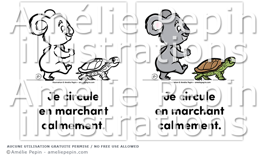 Règle de classe illustrée avec un koala et une tortue: "Je circule en marchant calmement."