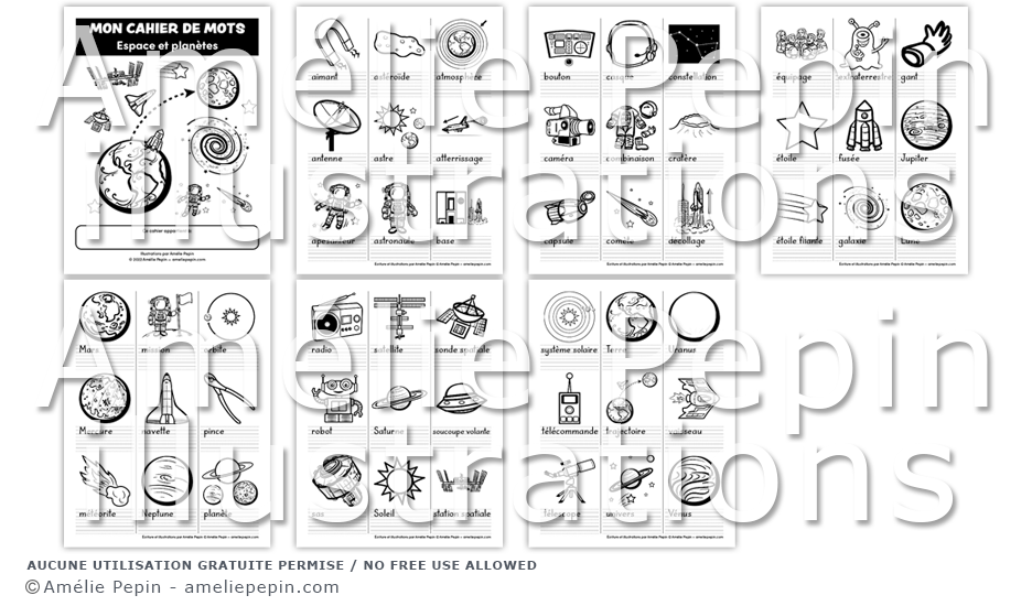 Utilisez ce document en tant que recueil de mots illustrés (dictionnaire) ou comme cahier d'écriture de mots sur le thème de l'espace. Les enfants peuvent colorier les dessins. Quatre versions sont incluses: sans lignes (rectangles pour écrire), avec lignes trottoirs, lignes doubles ou lignes calligraphiques.