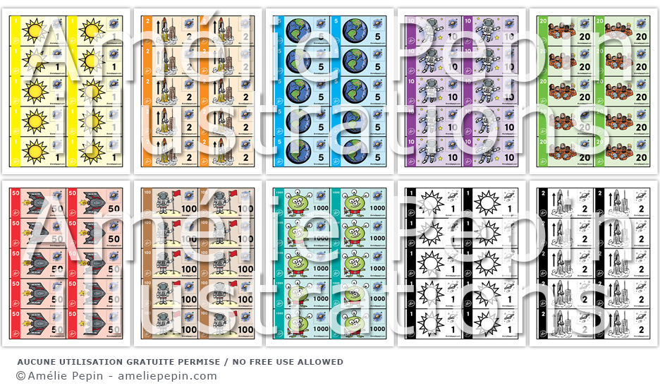 Ces documents contiennent les billets de 1$, 2$, 5$, 10$, 20$, 50$,100$ et 1000$. Sauvez de l'encre en imprimant la version en noir et blanc sur du papier teinté.