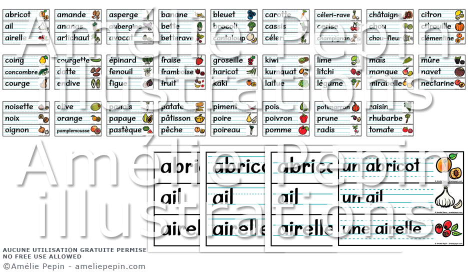 Les mots illustrés sont: abricot, ail, airelle, amande, ananas, artichaut, asperge, aubergine, avocat, banane, bette, betterave, bleuet, brocoli, cantaloup, carotte, cassis, céleri, céleri-rave, cerise, champignon, châtaigne, chou, chou-fleur, citron, citrouille, clémentine, coing, concombre, courge, courgette, datte, endive, épinard, fenouil, figue, fraise, framboise, fruit, groseille, haricot, kaki, kiwi, kumquat, laitue, lime, litchi, légume, maïs, mangue, mirabelle, mûre, navet, nectarine, noisette, noix, oignon, olive, orange, pamplemousse, panais, papaye, pastèque, patate, pâtisson, pêche, piment, poire, poireau, pois, poivron, pomme, potimarron, prune, radis, raisin, rhubarbe, tomate.