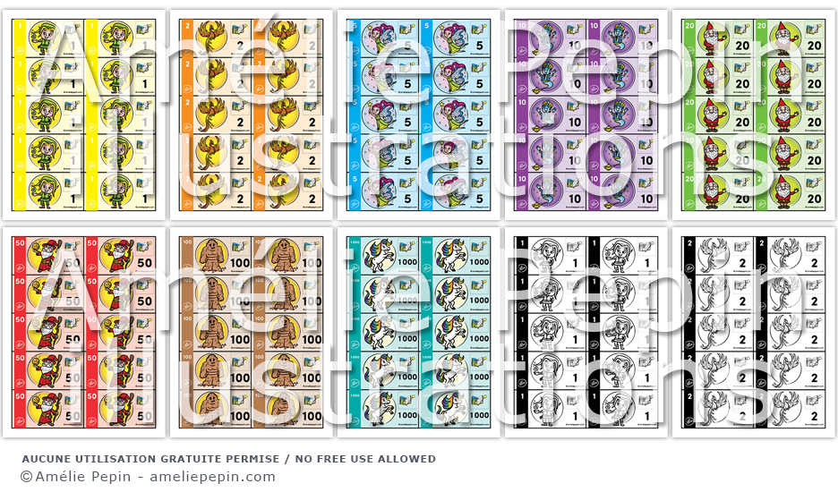 Ces documents contiennent les billets de 1$, 2$, 5$, 10$, 20$, 50$,100$ et 1000$. Sauvez de l'encre en imprimant la version en noir et blanc sur du papier teinté.