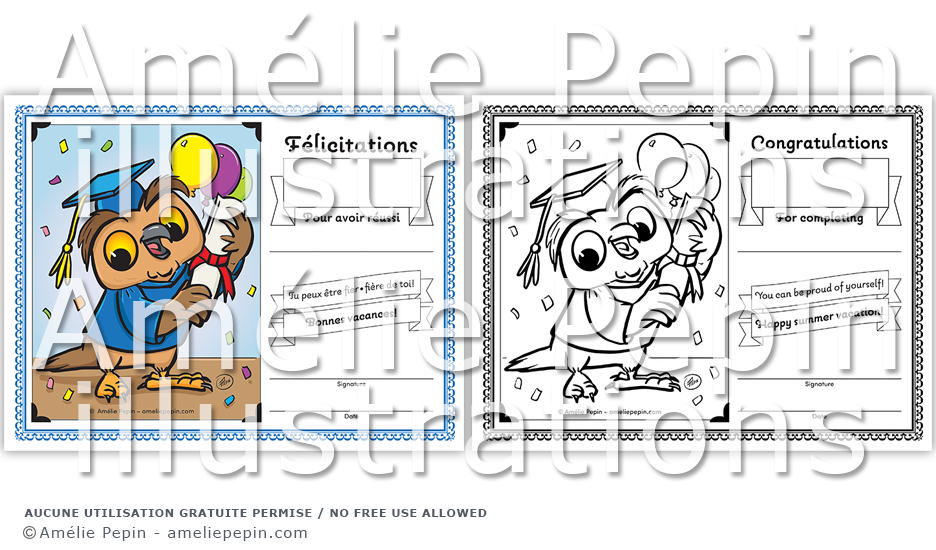 Récompensez la réussite d'une année scolaire complétée avec ce joyeux diplôme de hibou! Les informations à compléter doivent être écrites à la main.