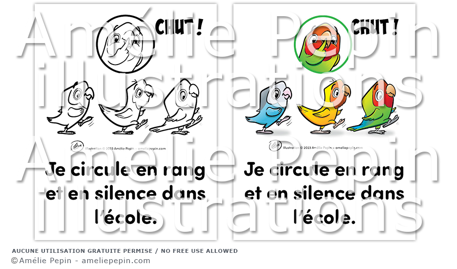 Règle de classe illustrée avec des inséparables: "Je circule en rang et en silence dans l'école."