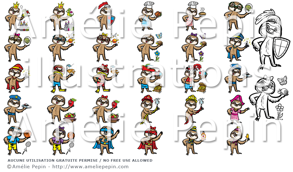 Ce dossier contient des images de paresseux pour illustrer les thèmes suivants: les châteaux, l'alimentation, les dinosaures, l'espace et les planètes, les insectes, la magie, la mer, les pirates, la sécurité (policiers), les pommes, les pompiers, les sports, les superhéros et le temps des sucres.