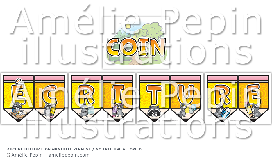 Créez un bel affichage pour votre coin écriture avec cette banderole illustrée avec des ratons laveurs. Chaque page contient deux fanions en forme de crayon. Chaque fanion mesure environ 7,5 po de hauteur sur 4,9 po de largeur. Découpez chaque lettre et collez-les à votre mur, ou encore, conservez une bande blanche au-dessus du fanion lorsque vous découpez ceux-ci pour pouvoir plier cette partie sur une corde à suspendre. De plus, une page contient le mot "coin" à découper en un seul morceau.