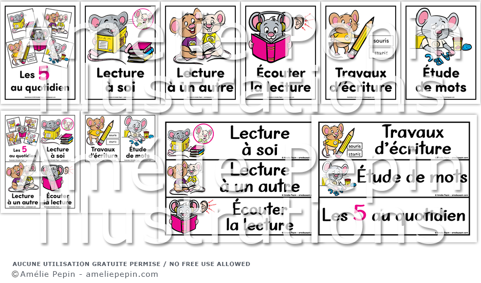Les 5 au quotidien représentés par des souris: lecture à soi, lecture à un autre, écouter la lecture, travaux d'écriture et étude de mots.