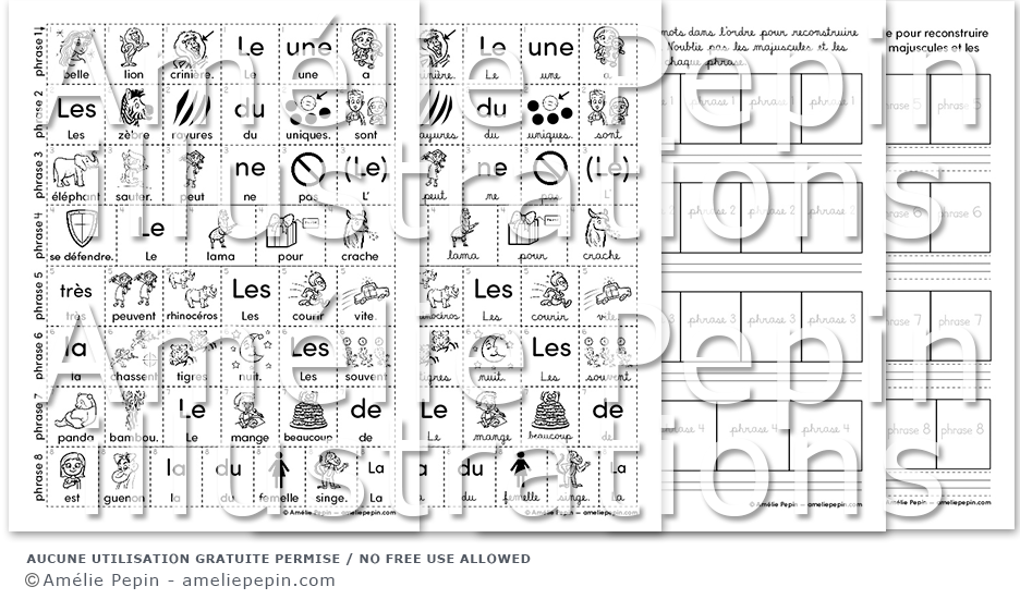L'enfant découpe les mots illustrés de la page 3 du document (une rangée correspond à une phrase). Il replace les mots en ordre pour former une phrase et il les colle dans les carrés aux pages 1 et 2. Il peut ensuite écrire les phrases obtenues dans les trottoirs (écriture script) ou dans les lignes doubles (écriture cursive). Dans chaque phrase, la lettre majuscule et le point sont indiqués sur les images afin d'aider l'enfant. Les phrases contiennent entre 5 et 7 mots.