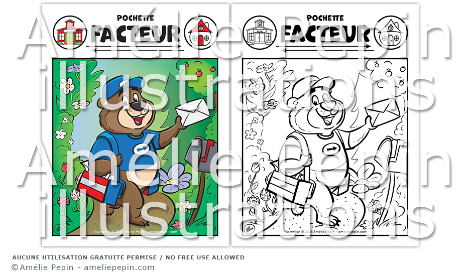 Couverture pour pochette facteur illustré avec un ours. Une version à colorier est incluse.