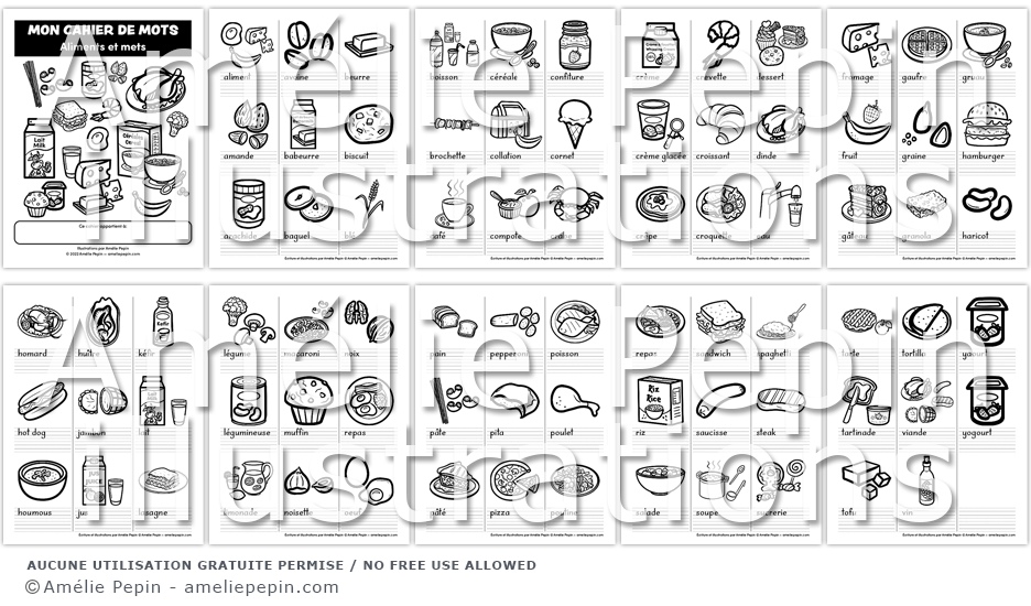 Utilisez ce document en tant que recueil de mots illustrés (dictionnaire) ou comme cahier d'écriture de mots sur le thème de l'alimentation (aliments et mets). Les enfants peuvent colorier les dessins. Quatre versions sont incluses: sans lignes (rectangles pour écrire), avec lignes trottoirs, lignes doubles ou lignes calligraphiques.