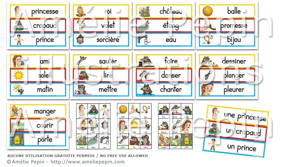 Les mots illustrés sont: princesse, crapaud, prince, roi, valet, sorcière, château, étang, eau, balle, promesse, bijou, ami, soleil, matin, sauter, lire, mettre, faire, danser, chanter, dessiner, plonger, pleurer, manger, courir et porte.