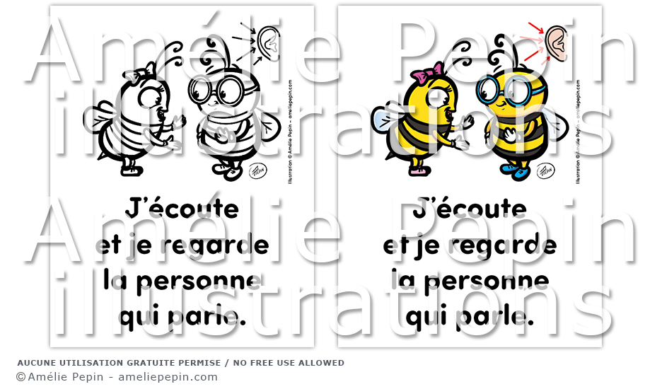 Règle de classe illustrée avec des abeilles: "J'écoute et je regarde la personne qui parle."