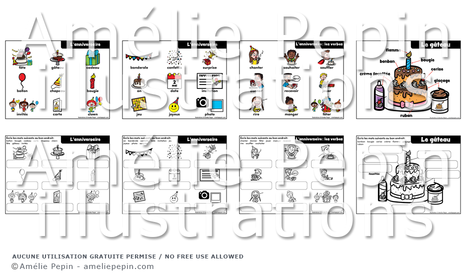 Imagier sur le thème des anniversaires. Le dossier contient 4 affiches et 4 feuilles d'activités pour apprendre le vocabulaire en lien avec les anniversaires. Dans les activités, l'enfant écrit les mots demandés au bon endroit. Il y a neuf mots illustrés par page.