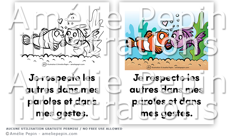 Règle de classe illustrée avec des poissons: "Je respecte les autres dans mes paroles et dans mes gestes."