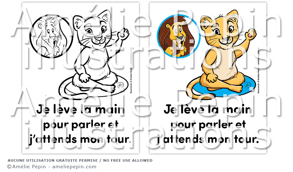 Règle de classe illustrée avec des lions: "Je lève la main pour parler et j'attends mon tour."