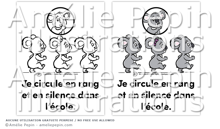 Règle de classe illustrée avec des koalas: "Je circule en rang et en silence dans l'école."
