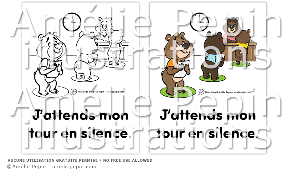 Règle de classe illustrée avec des ours: "J'attends mon tour en silence."