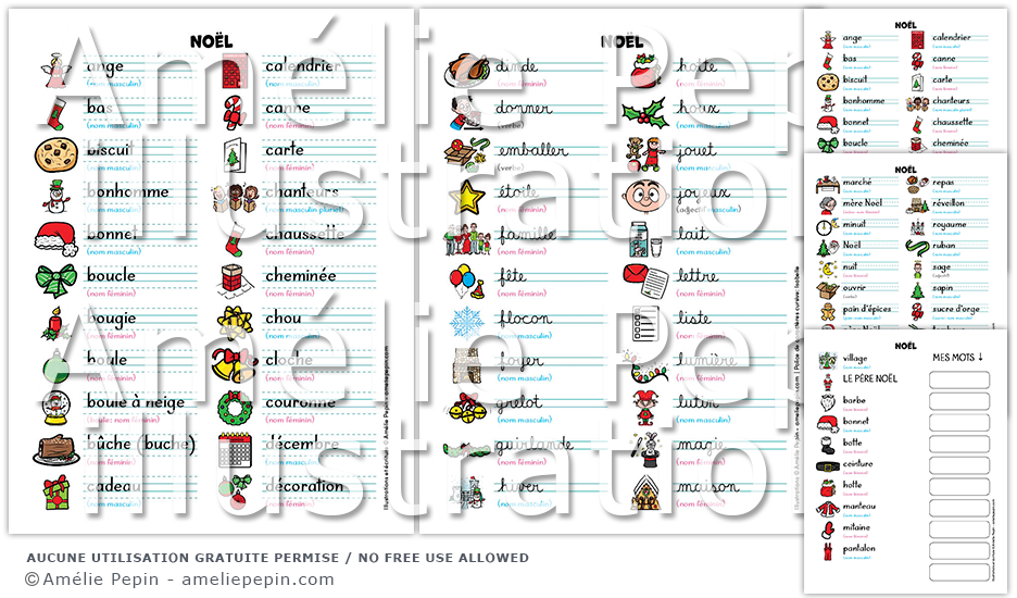 Les mots illustrés sont: ange, bas, biscuit, bonhomme, bonnet, boucle, bougie, boule, boule à neige, bûche, cadeau, calendrier, canne, carte, chanteurs, chaussette, cheminée, chou, cloche, couronne, décembre, décoration, dinde, donner, emballer, étoile, famille, fête, flocon, foyer, grelot, houx, guirlande, hiver, hotte, jouet, joyeux, lait, lettre, liste, lutin, magie, maison, marché, mère Noël, minuit, Noël, nuit, pain d'épices, père Noël, poinsettia, pôle Nord, renne, repas, réveillon, royaume, ruban, sage, sapin, tambour, traineau, trompette, vilain, village, lumière, ouvrir, sucre d'orge.