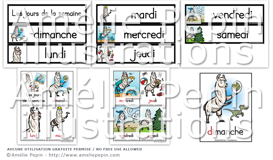 Chaque jour de la semaine est représenté par un lama avec un élément dont le son débute par la première syllabe du jour (DImanche, DInosaure).