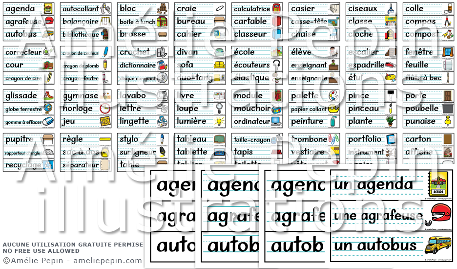 Les mots illustrés sont: agenda, agrafeuse, autobus, autocollant, balançoire, bibliothèque, bloc, boite à lunch, brosse, craie, bureau, cahier, calculatrice, cartable, classeur, casier, casse-tête, chaise, ciseaux, classe, cloche, colle, compas, compost, correcteur, cour, crayon de cire, crayon de couleur, crayon de plomb, crayon-feutre, crochet, dictionnaire, disque compact, divan, sofa, duo-tang, école, écouteurs, élastique, élève, enseignant, enseignante, escalier, espadrille, étui, fenêtre, feuille, flûte à bec, glissade, globe terrestre, gomme à effacer, gymnase, horloge, jeu, lavabo, lettre, lingette, livre, loupe, lumière, module, mouchoir, ordinateur, palette, papier collant, peinture, pince, pinceau, plante, porte, poubelle, punaise, pupitre, rapporteur d'angles, recyclage, règle, sac à dos, séparateur, stylo, surligneur, table, tableau, tablette, taille-crayon, tapis, toilette, trombone, vestiaire, vêtement, portfolio, instrument, papier, carton, affiche, tableau interactif.