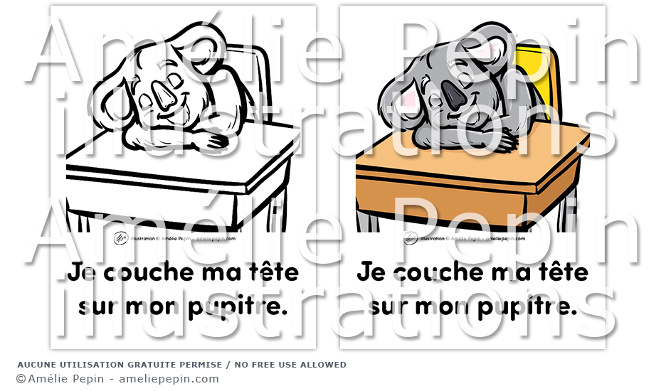 Règle de classe illustrée avec un koala: "Je couche ma tête sur mon pupitre."