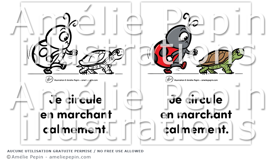 Règle de classe illustrée avec une coccinelle et une tortue: "Je circule en marchant calmement."