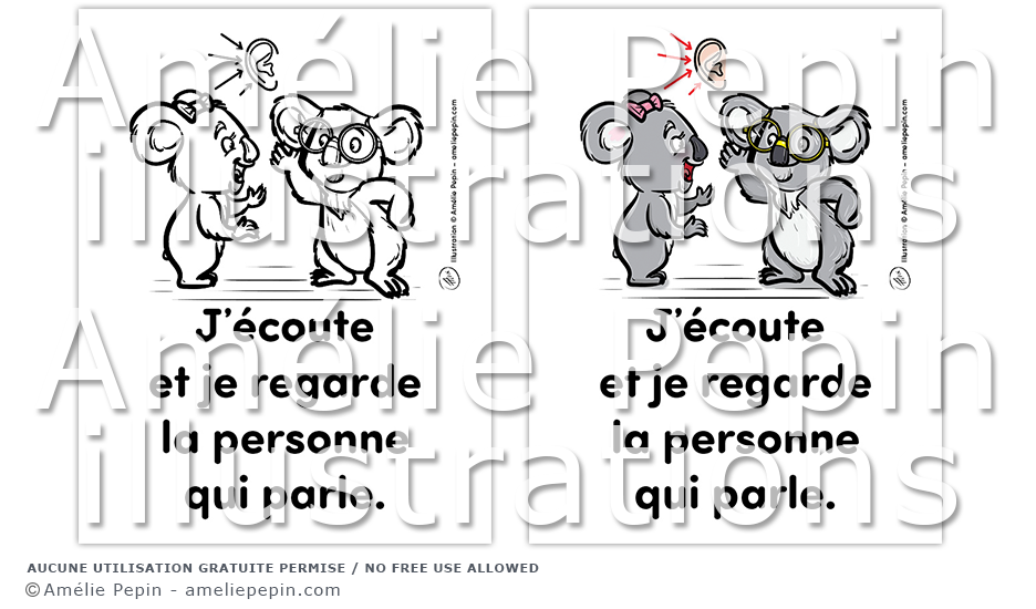 Règle de classe illustrée avec des koalas: "J'écoute et je regarde la personne qui parle."