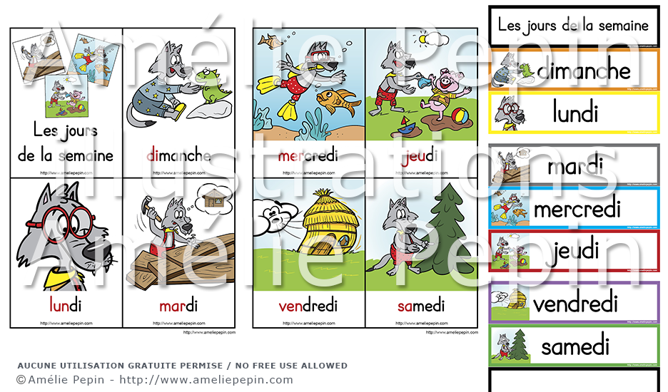 Chaque jour de la semaine est représenté par un loup avec un élément dont le son débute par la première syllabe du jour (DImanche, DInosaure).