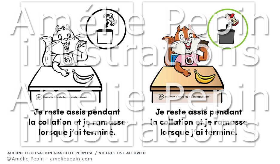 Règle de classe illustrée avec un écureuil: "Je reste assis pendant la collation et je ramasse lorsque j'ai terminé."