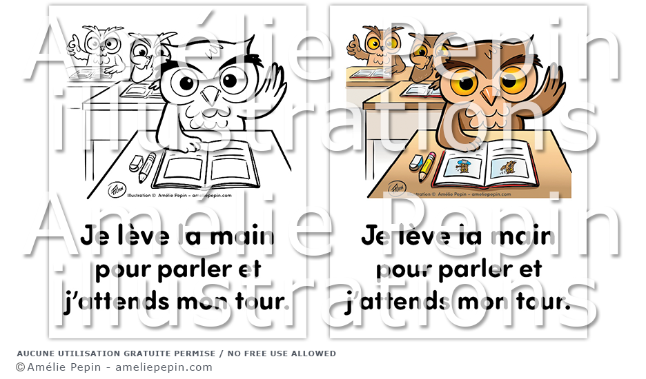 Règle de classe illustrée avec des hiboux assis au bureau: "Je lève la main pour parler et j'attends mon tour."