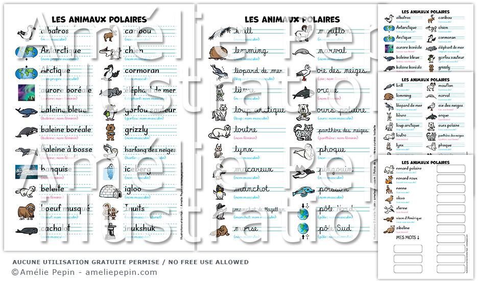 Animaux polaires - Liste de 51 mots illustrés (script et cursif)