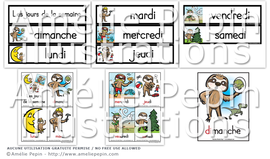 Chaque jour de la semaine est représenté par un paresseux avec un élément dont le son débute par la première syllabe du jour (DImanche, DInosaure).