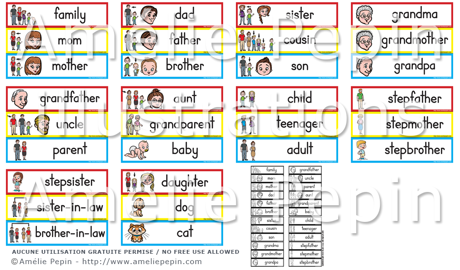 Les mots illustrés sont: family, mom, mother, dad, father, brother, sister, cousin, son, grandma, grandmother, grandpa, grandfather, uncle, parent, aunt, grandparent, baby, child, teenager, adult, stepfather, stepmother, stepbrother, stepsister, sister-in-law, brother-in-law, daughter, dog, cat.