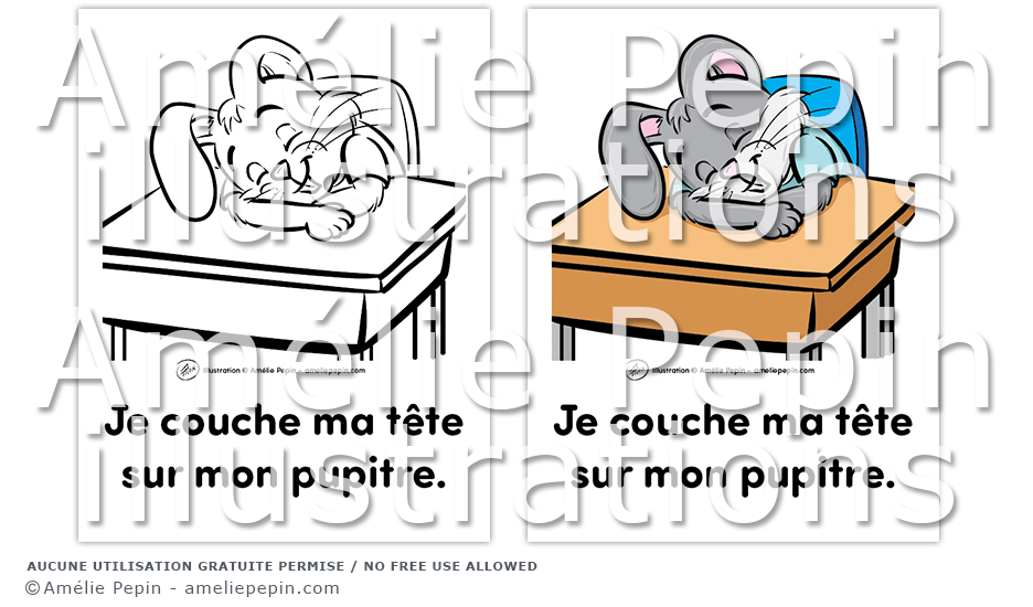 Règle de classe illustrée avec un lapin: "Je couche ma tête sur mon pupitre."
