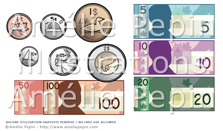 À noter que la "cenne noire" fait partie des pictogrammes afin de représenter les unités même si elle ne fait plus partie de notre système monétaire. Ces pictogrammes sont conçus pour être imprimés d'une taille maximale d'environ 5 X 5 po.