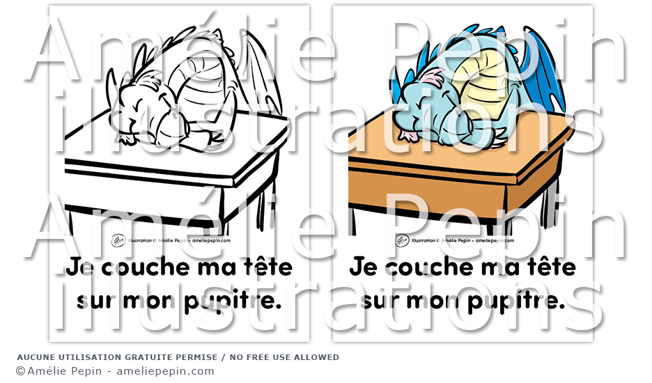 Règle de classe illustrée avec un dragon: "Je couche ma tête sur mon pupitre."