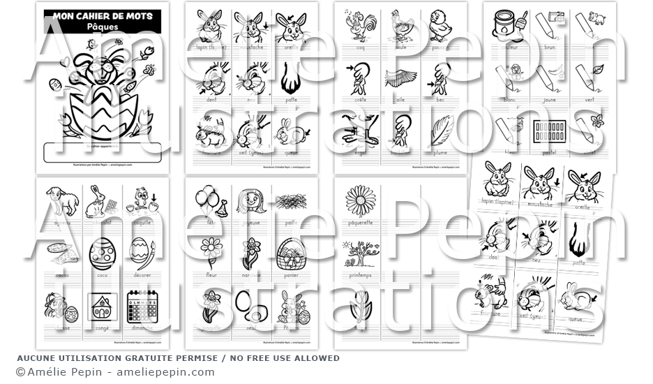 L'enfant s'exerce à écrire les mots en lien avec Pâques. Les mots sont illustrés et écrits en script. Choisissez entre une version avec des lignes trottoirs ou avec des lignes doubles. Les mots sont: lapin (lapine), dent, fourrure, moustache, nez, oeil (yeux), oreille, patte, queue, coq, crête, ergot, poule, aile, barbillon, poussin, bec, plume, couleur, blanc, bleu, brun, jaune, pastel, rose, vert, violet, agneau, cacao, chasse, chocolat, coco, congé, coquille, décorer, dimanche, fête, fleur, jonquille, joyeuse, narcisse, oeuf, paille, panier, Pâques, pâquerette, printemps, tulipe.