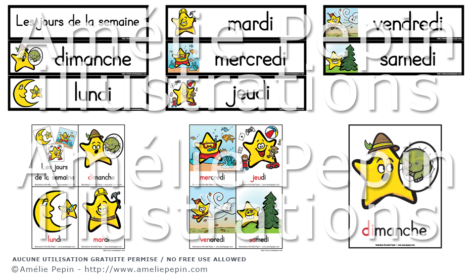 Chaque jour de la semaine est représenté par une étoile avec un élément dont le son débute par la première syllabe du jour (DImanche, DInosaure).