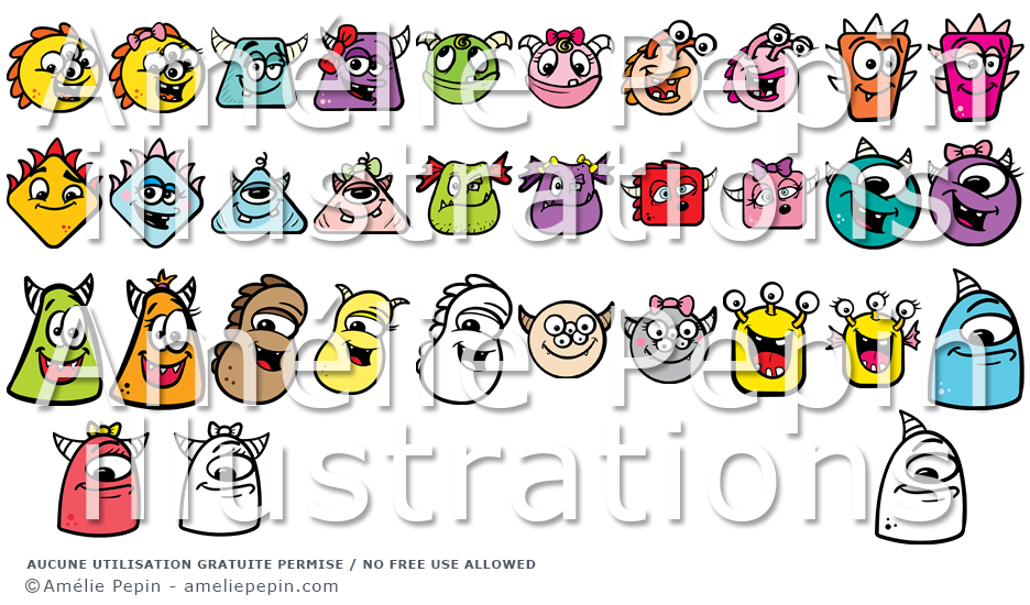 Ce dossier contient 30 modèles de visages de monstre de différentes formes (filles et garçons) en couleurs et en noir et blanc pour un total de 60 pictogrammes.