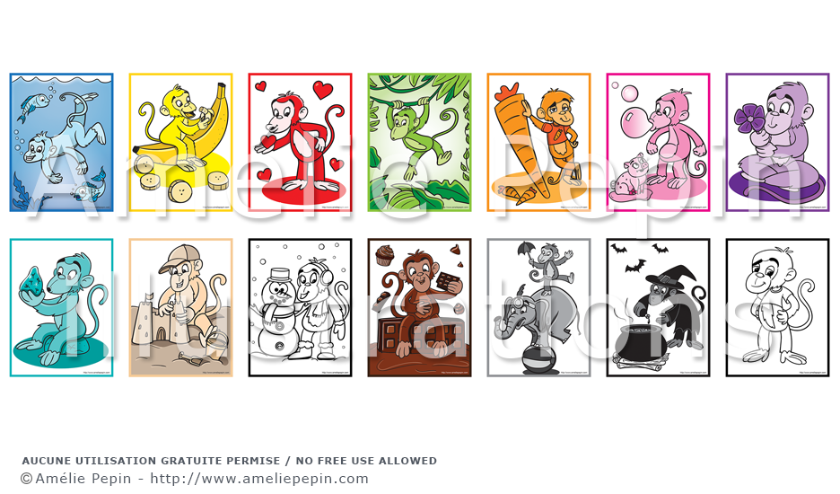 Si vous séparez votre groupe en plusieurs équipes de couleurs différentes, vous pouvez utiliser ces affiches pour les identifier. Puisque les singes possèdent un élément qui représente chaque couleur, les daltoniens pourront reconnaître les couleurs illustrées. De plus, ces affiches peuvent vous servir pour les thèmes de l'alimentation, de la Saint-Valentin, de la nature (plantes et fleurs), la ferme, le cirque et l'Halloween. Vous pouvez colorier la dernière page pour obtenir une couleur supplémentaire.